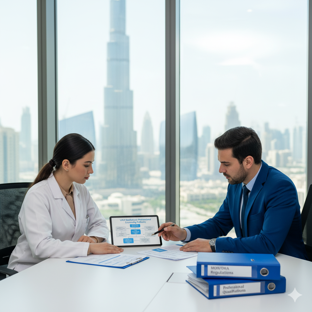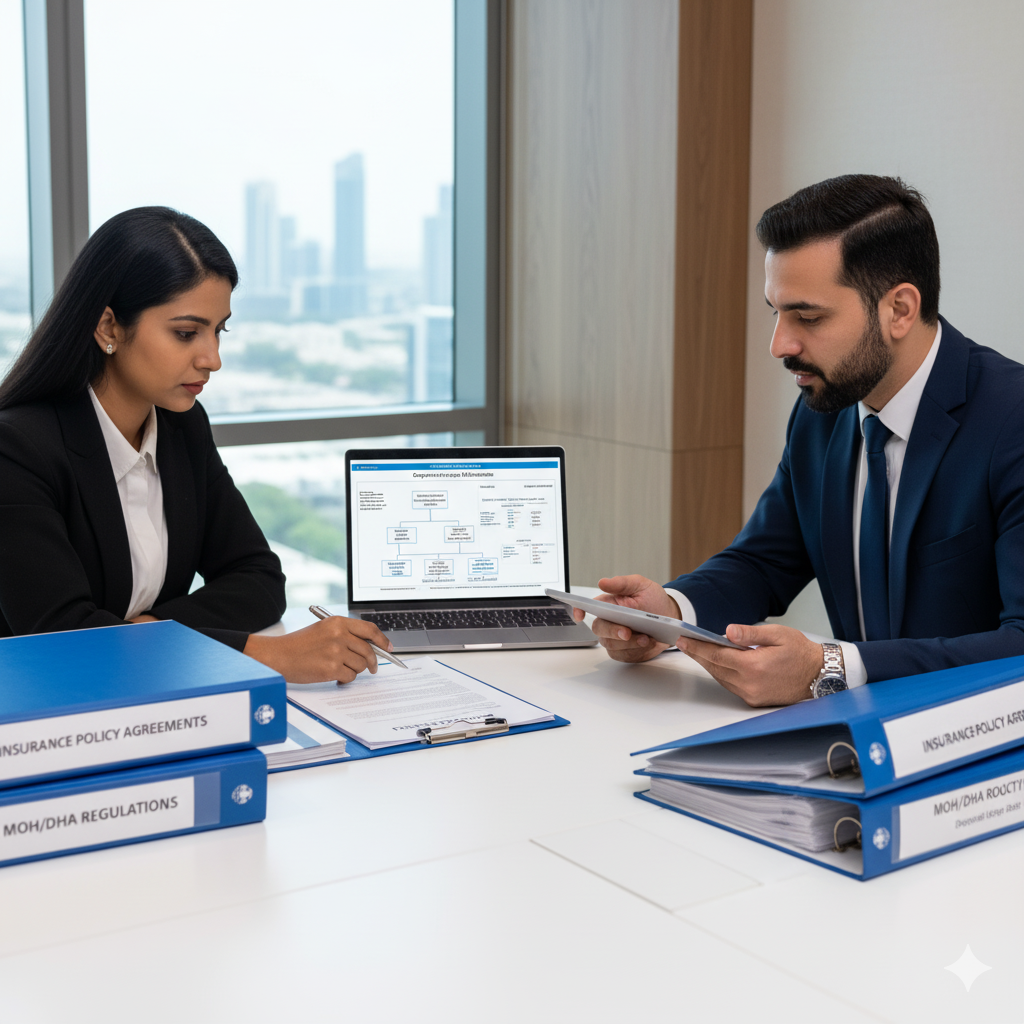 Involving MOH, DHA, trade name registration, economic department process, and civil defence approvals.